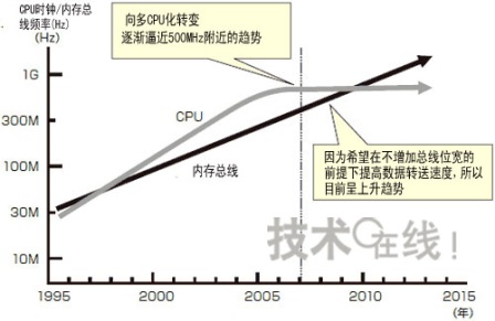 其原動力毋庸置疑是CPU的進步(即計算機系統(tǒng)的大規(guī)?;蜁r鐘的高速化)。車載導航儀的CPU時鐘和內(nèi)存總線時鐘頻率近來得到了快速提高(圖4)。CPU時鐘頻率正在逼近上限,今后,提高性能可能要依賴在一個LSI內(nèi)配置多個CPU的多CPU化進程。而另一方面,DRAM的內(nèi)存總線還在以不增加位寬的前提下提高性能,因此,時鐘頻率的上升勢不可擋。