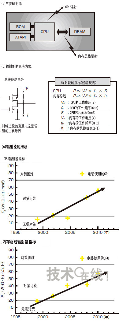芯片面積和時鐘頻率的增加容易導致輻射電磁噪聲增大。因此,對這些輻射源的輻射進行預測管理會逐漸成為重要環(huán)節(jié)。對于車載導航儀的核心(Navi-Core),如圖5(a)所示,CPU和總線是主要輻射源。由經(jīng)驗可知,直接來自于CPU的輻射能指標Pc與工作電壓的平方、工作頻率、芯片面積分別成正比,這些數(shù)值的積被作為“輻射能指標”應用到了預測管理(圖5(b)注1)之中。內(nèi)存總線的輻射能指標Pm也同樣與工作電壓的平方、工作頻率、內(nèi)存總線位寬的積成正比。[page]