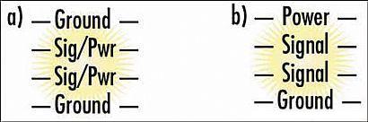 [page]第一種為首選方案,PCB的外層均為地層,中間兩層均為信號/電源層。信號層上的電源用寬線走線,這可使電源電流的路徑阻抗低,且信號微帶路徑的阻抗也低。從EMI控制的角度看,這是現(xiàn)有的最佳4層PCB結(jié)構(gòu)。