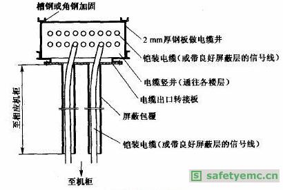 (3)電纜豎井處的電纜進出由于電纜豎井是作為同一個屏蔽區(qū)域,從電纜豎井至各層機房(非屏蔽區(qū))的管線處理也非常重要。做法如圖2所示