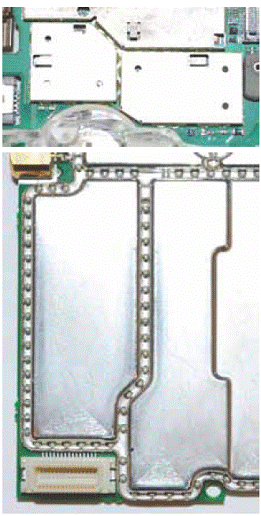如果PCB板上有多個(gè)區(qū)域需要屏蔽,有的工程師會(huì)采用框蓋技術(shù)。雖然這種技術(shù)能將每個(gè)腔體與外界干擾屏蔽開來,但外框與蓋子的內(nèi)部開孔對于干擾非常敏感。熱成型多腔屏蔽體能讓各個(gè)腔體對外界干擾的屏蔽效果保持一致。實(shí)際上,用于安裝這些屏蔽體的球形焊料有兩厘米的接觸點(diǎn),這確保了產(chǎn)品的性能能高達(dá)12GHz,并且球形提供了兩層的接觸,有一定的冗余。另一方面,框蓋屏蔽體通過凹陷保證接觸,這一般需要5毫米的空間。而且,蓋子一般是剛性的,移動(dòng)不靈活,而且蓋子的翻轉(zhuǎn)通常會(huì)破壞電氣接觸,因此框蓋技術(shù)并不能提供與熱成型屏蔽體相同的可靠性能。
