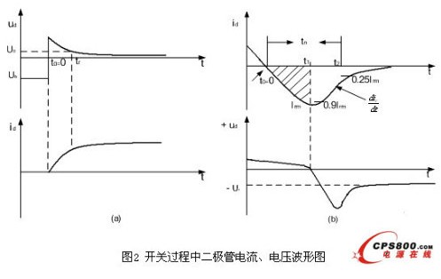 開(kāi)關(guān)管工作在硬開(kāi)關(guān)條件下開(kāi)關(guān)電源自身產(chǎn)生電磁干擾的根本原因,就是在其工作過(guò)程中的開(kāi)關(guān)管的高速開(kāi)關(guān)及整流二極管的反向恢復(fù)產(chǎn)生高di/dt和高dv/dt,它們產(chǎn)生的浪涌電流和尖峰電壓形成了干擾源。開(kāi)關(guān)管工作在硬開(kāi)關(guān)時(shí)還會(huì)產(chǎn)生高di/dt和高dv/dt,從而產(chǎn)生大的電磁干擾。圖1繪出了接感性負(fù)載時(shí),開(kāi)關(guān)管工作在硬開(kāi)關(guān)條件下的開(kāi)關(guān)管的開(kāi)關(guān)軌跡,圖中虛線為雙極性晶體管的安全工作區(qū),如果不改善開(kāi)關(guān)管的開(kāi)關(guān)條件,其開(kāi)關(guān)軌跡很可能會(huì)超出安全工作區(qū),導(dǎo)致開(kāi)關(guān)管的損壞。由于開(kāi)關(guān)管的高速開(kāi)關(guān),使得開(kāi)關(guān)電源中的高頻變壓器或儲(chǔ)能電感等感性負(fù)載在開(kāi)關(guān)管導(dǎo)通的瞬間,迫使變壓器的初級(jí)出現(xiàn)很大的浪涌電流,將造成尖峰電壓。開(kāi)關(guān)管在截止期間,高頻變壓器繞組的漏感引起的電流突變,從而產(chǎn)生反電勢(shì)E=-Ldi/dt,其值與電流變化率(di/dt)成正比,與漏感量成正比,疊加在關(guān)斷電壓上形成關(guān)斷電壓尖峰,從而形成電磁干擾。此外,開(kāi)關(guān)管上的反向并聯(lián)二極管的反向恢復(fù)特性不好,或者電壓尖峰吸收電路的參數(shù)選擇不當(dāng)也會(huì)造成電磁干擾。由整流二極管的反向恢復(fù)引起的干擾源有兩個(gè),它們分別是輸入整流二極管和輸出整流二極管。它們都是由電流的換向引起的干擾。由圖2表明,t0=0時(shí)二極管導(dǎo)通,二極管的電流迅速增大,但是其管壓降不是立即下降,而會(huì)出現(xiàn)一個(gè)快速的上沖。其原因是在開(kāi)通過(guò)程中,二極管PN結(jié)的長(zhǎng)基區(qū)注入足夠的少數(shù)載流子,發(fā)生電導(dǎo)調(diào)制需要一定的時(shí)間tr。該電壓上沖會(huì)導(dǎo)致一個(gè)寬帶的電磁噪聲。而在關(guān)斷時(shí),存在于PN結(jié)長(zhǎng)基區(qū)的大量過(guò)剩少數(shù)載流子需要一定時(shí)間恢復(fù)到平衡狀態(tài)從而導(dǎo)致很大的反向恢復(fù)電流。當(dāng)t=t1時(shí),PN結(jié)開(kāi)始反向恢復(fù),在t1-t2時(shí)間內(nèi),其他過(guò)剩載流子依靠復(fù)合中心復(fù)合,回到平衡狀態(tài)。這時(shí)管壓降又出現(xiàn)一個(gè)負(fù)尖刺。通常t2《t1,所以該尖峰是一個(gè)非常窄的尖脈沖,產(chǎn)生的電磁噪聲比開(kāi)通時(shí)還要強(qiáng)。因此,整流二極管的反向恢復(fù)干擾也是開(kāi)關(guān)電源中的一個(gè)重要干擾源。