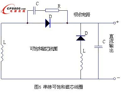 二次整流回路中,與整流二極管D串接可飽和磁芯的線圈,如圖5所示??娠柡痛判揪€圈在通過(guò)正常電流時(shí)磁芯飽和,電感量很小,不會(huì)影響電路正常上作。一旦電流要反向時(shí),磁芯線圈將產(chǎn)生很大的反電動(dòng)勢(shì),阻止反向電流的上升。因此,將它與二極管D串聯(lián)就能有效地抑制二極管D的反向浪涌電流。