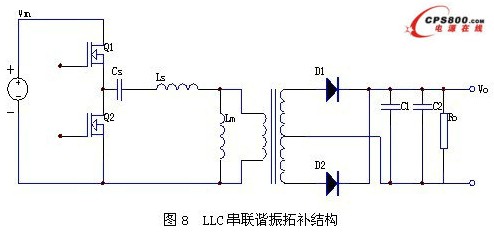 圖8為L(zhǎng)LC串聯(lián)諧振的拓?fù)浣Y(jié)構(gòu)。從圖中可以看出,兩個(gè)主開(kāi)關(guān)Ql和Q2構(gòu)成一個(gè)半橋結(jié)構(gòu),其驅(qū)動(dòng)信號(hào)是固定50%占空比的互補(bǔ)信號(hào),電感Ls、電容Cs和變壓器的勵(lì)磁電感Lm構(gòu)成一個(gè)LLC諧振網(wǎng)絡(luò)。在LLC串聯(lián)諧振變換器中,由于勵(lì)磁電感Lm串聯(lián)在諧振回路中,開(kāi)關(guān)頻率可以低于LC的本征諧振頻率fs,而只需高于LLC的本征諧振頻率fm便可實(shí)現(xiàn)主開(kāi)關(guān)的零電壓開(kāi)通。所以,LLC串聯(lián)諧振可以降低主開(kāi)關(guān)管上的EMI,把電磁輻射干擾(EMI)減至最少。在LLC諧振拓?fù)渲?,只要諧振電流還沒(méi)有下降到零,頻率對(duì)輸出電壓的調(diào)節(jié)趨勢(shì)就沒(méi)有變,即隨著頻率的下降輸出電壓將繼續(xù)上升,同時(shí)由于諧振電流的存在,半橋上下兩個(gè)主開(kāi)關(guān)的零電壓開(kāi)通條件就得以保證。因此,LLC諧振變換器的工作頻率有一個(gè)下限,即Cs與Ls和Lm的串聯(lián)諧振頻率fm。在工作頻率范圍fm<f<fs內(nèi),原邊的主開(kāi)關(guān)均工作在零電壓開(kāi)通的條件下,并且不依賴(lài)于負(fù)載電流的大小。同時(shí),副邊的整流二極管工作在斷續(xù)或臨界斷續(xù)狀態(tài)下,整流二極管可以零電流條件下關(guān)斷,其反向恢復(fù)的問(wèn)題得以解決,不再有電壓尖峰產(chǎn)生。