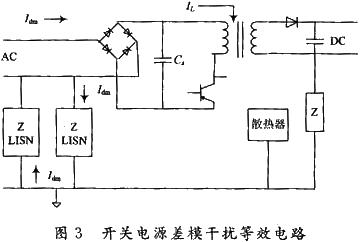 如圖3所示,當開關(guān)管轉(zhuǎn)為“開”時,儲能電容Cs的能量由AC電網(wǎng)和整流橋提供,他被開關(guān)管變換器的快速開關(guān)頻率所變換,并通過變壓器形成脈沖電流IL,他具有非常豐富的開關(guān)頻率諧波。儲能電容不是一個純電容,他有串聯(lián)電阻和電感。當整流橋處開關(guān)管“開”時,在AC電網(wǎng)端,IL會產(chǎn)生一個由電容的L,R,C所呈現(xiàn)的阻抗電壓,這就是開關(guān)電源產(chǎn)生差模發(fā)射源的原理。差模電流Idm和信號電流IL沿著導(dǎo)線、變壓器初級、開關(guān)管組成的回路流通。