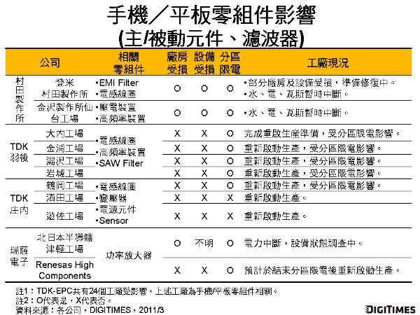 在面板、開關(guān)、存儲器、電池芯、異方性導電膜(ACF)等手機/平板相關(guān)零組件方面,除東芝位于四日市生產(chǎn)NAND Flash的工廠未受到日本311地震沖擊,其余包含TDK、日立顯示、日立化成、SMK、Sony化學、Sony Energy Device等業(yè)者的生產(chǎn)工廠,分別受到廠房、設(shè)備受損或停止生產(chǎn)的大小不等的影響。