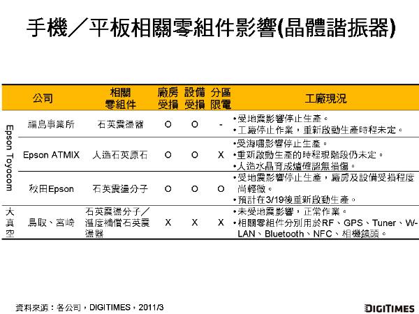 其余零組件因可被替代性高,或日本業(yè)者大部分工廠居于日本未受地震影響的區(qū)域及海外,故對整體手機/平板產(chǎn)業(yè)的影響將十分有限。