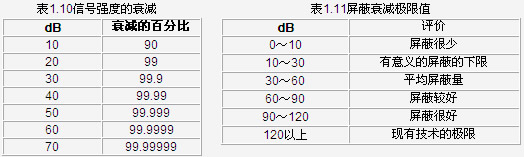 表1.10和表1.11給出了不同的屏蔽效能,吸收損耗的計(jì)算公式如下: