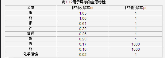 表1.12給出了一些常用屏蔽材料的相對(duì)導(dǎo)電率和導(dǎo)磁率。