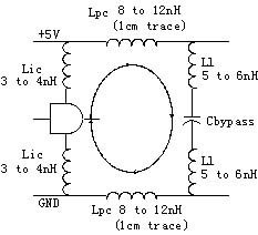 圖5為電流環(huán)的模型。從電流環(huán)模型中我們可以看出,環(huán)路中存在寄生電感,它們在高頻狀態(tài)下表現(xiàn)為環(huán)路的阻抗可導(dǎo)致供給電源產(chǎn)生尖峰,并會輻射電磁波從而干擾系統(tǒng)的其他部分。環(huán)路中Ll為電容管腳引線的封裝電感;Lpc為電容管腳到器件電源或者地管腳之間的PCB傳輸線的寄生電感;Lic為器件管腳引線的寄生電感。另外,在前面我們討論過電容本身也是具有寄生電感ESL的。這樣回路的總電感為:L=2Ll+2Lpc+2Lic+ESL。由于環(huán)路的寄生電感將會給整個系統(tǒng)帶來電磁干擾,產(chǎn)生電壓尖峰,這個電壓尖峰值同串聯(lián)電感之間存在一定的關(guān)系,近似計算公式如下: