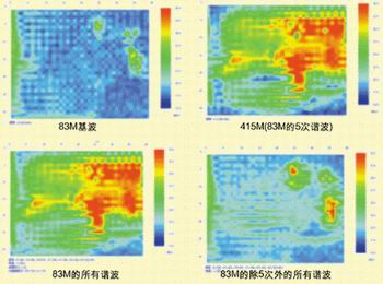 圖3的各個(gè)空間分布圖,是通過指定頻率點(diǎn)來看該頻率點(diǎn)的空間腹部圖。通過在圖中最上面的頻譜圖中用×指定頻率點(diǎn)后得到的??梢灾付ㄒ粋€(gè)頻率點(diǎn)查看每個(gè)頻率點(diǎn)的空間分布,也可以指定多個(gè)頻率點(diǎn),例如指定83M的所有諧波點(diǎn),查看總的頻譜圖。
