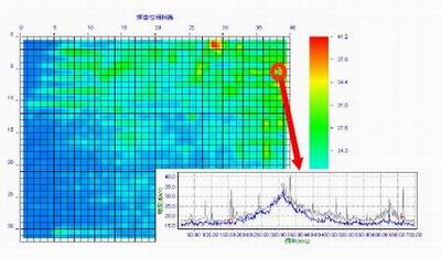 在執(zhí)行頻譜/空間掃描功能時(shí),把工作著的PCB放置到掃描器上,PCB被掃描器的柵格劃分為7.6mm×7.6mm的小格(每個(gè)小格含有一個(gè)H場(chǎng)探頭),執(zhí)行對(duì)每個(gè)探頭的全頻段掃描(頻率范圍可以從10kHz-3GHz)后,Emscan最終給出兩張圖,分別為合成頻譜圖(圖1)和合成空間圖(圖2)。