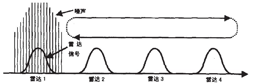 掃頻干擾方式主要在雷達(dá)的整個(gè)調(diào)諧頻帶內(nèi)重復(fù)進(jìn)行點(diǎn)干擾,雖然此方式不能比寬帶噪聲干擾給出更多的平均功率,但是掃頻干擾使每個(gè)雷達(dá)周期性地承擔(dān)最大可能的功率。事實(shí)證明,通過調(diào)整掃描頻率以保持雷達(dá)通帶內(nèi)的干擾時(shí)間約等于雷達(dá)發(fā)射脈沖寬度,掃頻干擾方式在產(chǎn)生假目標(biāo)方面是最有效的。并且對(duì)于掃描雷達(dá),掃頻干擾可產(chǎn)生足夠可信賴的假目標(biāo)。其工作方式如圖3所示。