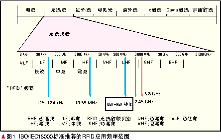 圖1顯示了ISO/IEC18000標(biāo)準(zhǔn)推薦的RFID應(yīng)用頻率范圍,從圖上可以看出RFID系統(tǒng)分為低頻(LF)125~134 kHz、高頻(HF)13.56 MHz、超高頻(UHF)860~960 MHz與2.4 GHz和微波頻段(MW)5.8 GHz。