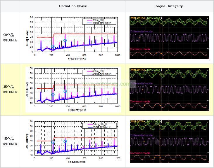 使用共模扼流線圈時的靜噪效果及信號波形評測圖5顯示的MHL信號線使用各種共模扼流線圈時的輻射噪聲/信號波形評測結(jié)果。共模扼流線圈在產(chǎn)生噪聲的30MHz~1GHz頻率段內(nèi),按照阻抗由高到低的順序,分別使用以下3種類型(90Ω、45Ω、15Ω@100MHz) (靜態(tài)特性請參考圖6) 來進行測量。