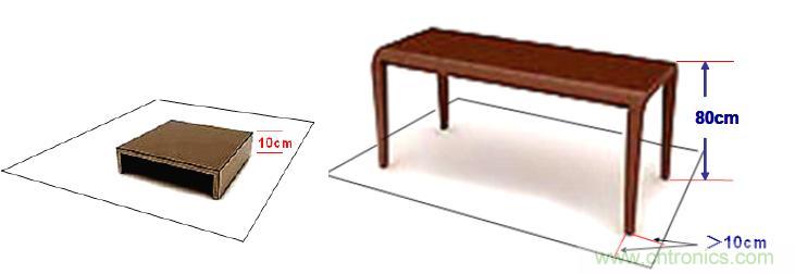 ④ 落地的試品要用0.1±0.01m的絕緣座隔開后放在參考接地板上。對于臺(tái)式試品,應(yīng)放置在離參考接地板高度為0.8±0.08m的木頭臺(tái)子上,試品(或試驗(yàn)臺(tái)子)距參考接地板邊緣的最小尺寸滿足項(xiàng)①(0.1m)的規(guī)定。