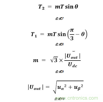 由此可知SVPWM實(shí)現(xiàn)步驟:先通過(guò)Uout判斷出電壓矢量所在扇區(qū),再根據(jù)相鄰的電壓矢量及Uout計(jì)算出兩個(gè)基本矢量作用時(shí)間;最后根據(jù)兩個(gè)基本矢量作用時(shí)間計(jì)算出PWM開(kāi)關(guān)時(shí)間及占空比。