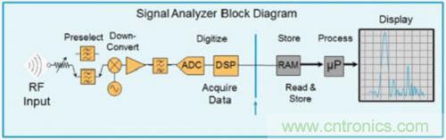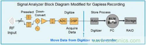 在對系統(tǒng)干擾進(jìn)行特征分析時,系統(tǒng)工程師通常依賴信號分析儀來完成長時間的連續(xù)錄存,如圖1所示。長時間錄存的主要局限是,測試設(shè)備中板子的內(nèi)存容量不夠大。目標(biāo)信號首先進(jìn)入分析儀的RF輸入,隨后被處理,產(chǎn)生圖1右側(cè)所顯示的波形。假設(shè)系統(tǒng)使用了一個固定本機(jī)振蕩器,該儀器捕獲帶寬內(nèi)的所有目標(biāo)信號在到達(dá)藍(lán)色豎線之前,都會經(jīng)過實(shí)時處理。一旦采樣信號進(jìn)入緩存或RAM中,該儀器便不再關(guān)注新進(jìn)入的數(shù)字樣本。相反,它必須處理先前錄存的采樣數(shù)據(jù)。