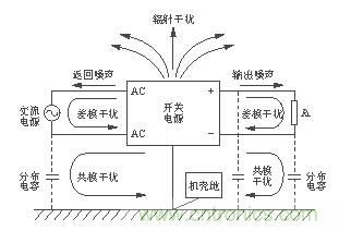 開關(guān)電源的電磁噪聲從噪聲源來說可以分為兩大類。一類是外部噪聲,例如,通過電網(wǎng)傳輸過來的共模和差模噪聲、外部電磁輻射對(duì)開關(guān)電源控制電路的干擾等。另一類是開關(guān)電源自身產(chǎn)生的電磁噪聲,如開關(guān)管和整流管的電流尖峰產(chǎn)生的諧波及電磁輻射干擾。