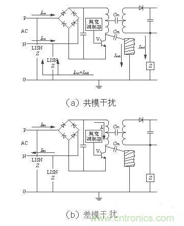電源線噪聲是電網(wǎng)中各種用電設(shè)備產(chǎn)生的電磁騷擾沿著電源線傳播所造成的。電源線噪聲分為兩大類:共模干擾、差模干擾。共模干擾(Common-mode Interference)定義為任何載流導(dǎo)體與參考地之間的不希望有的電位差;差模干擾(Differential-mode Interference)定義為任何兩個(gè)載流導(dǎo)體之間的不希望有的電位差。兩種干擾的等效電路如圖2[1]所示。圖中CP1為變壓器初、次級(jí)之間的分布電容,CP2為開關(guān)電源與散熱器之間的分布電容(即開關(guān)管集電極與地之間的分布電容)。
