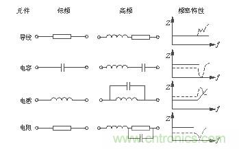 如圖4所示,在高頻工作下的元件都有高頻寄生特性[2],對(duì)其工作狀態(tài)產(chǎn)生影響。高頻工作時(shí)導(dǎo)線變成了發(fā)射線、電容變成了電感、電感變成了電容、電阻變成了共振電路。觀察圖4中的頻率特性曲線可以發(fā)現(xiàn),當(dāng)頻率過高時(shí)各元件的頻率特性產(chǎn)生了相當(dāng)大的變化。為了保證開關(guān)電源在高頻工作時(shí)的穩(wěn)定性,設(shè)計(jì)開關(guān)電源時(shí)要充分考慮元件在高頻工作時(shí)的特性,選擇使用高頻特性比較好的元件。另外,在高頻時(shí),導(dǎo)線寄生電感的感抗顯著增加,由于電感的不可控性,最終使其變成一根發(fā)射線。也就成為了開關(guān)電源中的輻射干擾源。