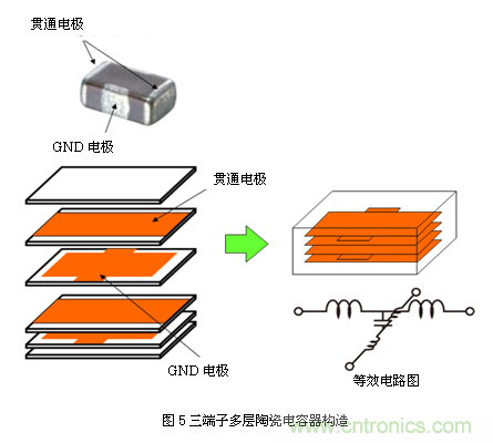 如圖5所示,片狀三端子電容器雖名為三端,但實(shí)為四端結(jié)構(gòu)。這是因?yàn)?,雖然四端設(shè)計(jì)可減少接地端電感,但電氣特性方面,無論哪個(gè)端子都具備相同電位。而引線型三端子電容器原本就為三端結(jié)構(gòu),因此貼片化后仍被稱為"三端"。[page]