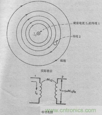 兩個(gè)導(dǎo)體相耦合的隨時(shí)間變化的磁場,可用兩個(gè)電路之間的互感來表示,見下圖: