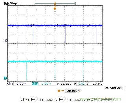 圖 5顯示了13.2V輸入的開關節(jié)點??梢钥吹?,LT8614與理想方波的偏離極小,如通道2所示。圖3、4和5中的所有時間域測量結果都是用 500MHzTektronixP6139A探頭測得的,封閉的探頭尖端屏蔽罩連接至PCBGND平面,測試均在標準演示電路板上進行。[page]