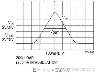 除了面向汽車環(huán)境的42V絕對最大輸入電壓額定值,器件的壓差表現(xiàn)也非常重要。常常需要支持至關重要的3.3V邏輯電源以應對冷車發(fā)動情況。在這種情況 下,LT8614SilentSwitcher穩(wěn)壓器保持接近LT861x系列的理想表現(xiàn)。LT8610/11/14器件不是像其他器件那樣提供更高的欠 壓閉鎖電壓和最大占空比箝位,而是以低至3.4V的電壓工作,而且只要有必要,就跳過若干周期,如圖6所示。這樣就產(chǎn)生了理想的壓差表現(xiàn),如圖7所示。