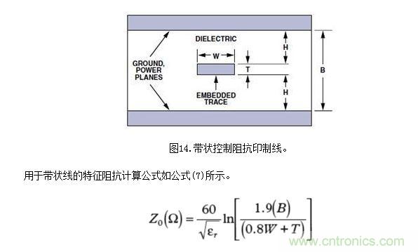 帶狀控制阻抗印制線(參見圖14)采用了兩層接地平面,信號印制線夾在其中。這種方法使用了較多的印制線,需要的PCB層數(shù)更多,對電介質(zhì)厚度變化敏感,而且成本更高--所以通常只用于要求嚴(yán)格的應(yīng)用中。