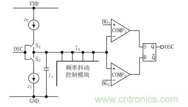 由圖1可以看出,頻率抖動(dòng)振蕩器由一個(gè)張弛振蕩器加上一個(gè)頻率抖動(dòng)模塊構(gòu)成。其工作原理:首先,開關(guān) S1閉合,電流源 I0給電容 Cc充電,充電剛開始時(shí)電容 Cc上極板的電壓小于 BG1和 BG2,RS 觸發(fā)器的輸出被置為低電平 0,當(dāng)電容上極板電壓 VA大于 BG2時(shí),RS 觸發(fā)器的輸出狀態(tài)處于保持狀態(tài),直到上極板電壓 VA大于 BG1之后 RS 觸發(fā)器的輸出翻轉(zhuǎn)被置為高電平1;此時(shí),開關(guān) S2導(dǎo)通,電流源 I1給電容Cc放電,當(dāng)VA減小到小于 BG1時(shí),RS 觸發(fā)器的輸出處于保持狀態(tài),當(dāng)VA減小到小于 BG2時(shí),RS 觸發(fā)器翻轉(zhuǎn)被置為低電平 0 ;于是,開關(guān) S1又閉合開始對(duì) Cc充電,如此周而復(fù)始,得到一個(gè)頻率固定的振蕩器。圖1中的電流源I0、 I1的電流相等,則振蕩器的占空比為 0.5。頻率抖動(dòng)控制模塊是通過計(jì)數(shù)器來周期性的切換加入到張弛振蕩器中充放電電容的大小,改變電壓 VA的充放電速度,從而來達(dá)到周期性的改變振蕩器頻率的目的,即實(shí)現(xiàn)了振蕩器頻率的抖動(dòng)。