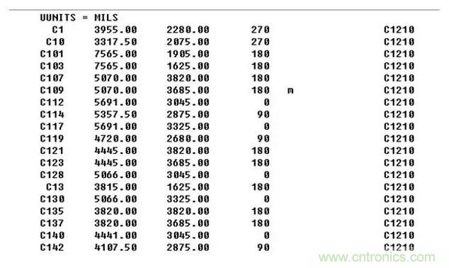 大家可以清晰可以的看到第一行表示的是單位mil。第一列是器件位號,第二列是X軸坐標(biāo),第三列是Y軸坐標(biāo),第四列是旋轉(zhuǎn)度數(shù),第五列是表示器件放在top面(空白)或者bottom面(m-Mirror的縮寫),第六列是器件封裝名。對于一個器件的定位信息來說,直接 感覺一下,似乎我們只需知道是哪個器件也就是器件位號,放置在哪一面,也就是在表面還是底面,旋轉(zhuǎn)度數(shù)以及具體的xy坐標(biāo),信息就全了。對于是哪種封裝類型似乎不是必需的,那么說到這,我想大家也就明白在遇到上述情況時,可以進(jìn)行一些更為簡單的操作了。
