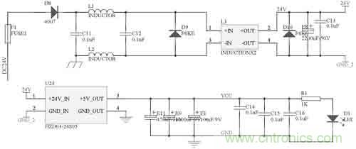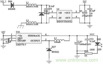 本控制模塊的電源電路如圖2所示。車載蓄電池—發(fā)電機的電源從24V_1處進(jìn)入,二極管D16主要是防止電源的正負(fù)極被誤接反。電感L1、L2對電源進(jìn)行濾波,和共模電感L3、電容C8配合,可以過濾掉電源中的尖峰脈沖。二極管D24 P6KE51A是脈沖干擾抑制器(TVS),它可以快速吸收超過額定電壓的尖峰脈沖,瞬時通過電流很大,最大功率可達(dá)500~1000W。電容E5和C9進(jìn)一步對電源進(jìn)行濾波。過濾干凈的電流通過開關(guān)電源芯片LM2576變換為系統(tǒng)使用的5V電源。電容E7和C11對輸出5V電源進(jìn)行濾波,電阻R18和發(fā)光二極管D28指示當(dāng)前是否有電。