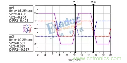 可以看到,兩次經(jīng)過零軸的時(shí)間由之前的5ns變成了4.8ns?;蛘哒f,N與P的長度差,引起了0.04UI的抖動。這時(shí)候,串行的Clock recovery該花點(diǎn)心思才能將其時(shí)鐘解出來了。而且在進(jìn)行時(shí)鐘與數(shù)據(jù)對位的時(shí)候,是對在0V這個(gè)階梯的左邊還是對在右邊呢?這又會引起時(shí)序問題的出現(xiàn)。