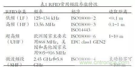 在應(yīng)用方面,低頻和高頻的電子標(biāo)簽,讀取距離較短、數(shù)據(jù)量少,因此適合用于近距離的識(shí)別。超高頻系統(tǒng)由于具有不同的電磁感應(yīng)方式,讀寫器和標(biāo)簽的讀取距離可>10 m,數(shù)據(jù)速率可達(dá)640 kbps。RIFD常用頻段參數(shù)特性,見表1。
