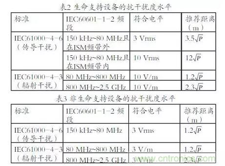 在IEC 60601-1-2《醫(yī)用電氣設(shè)備第1-2部分:安全通用要求并列標(biāo)準(zhǔn):電磁兼容要求和試驗(yàn)》中,規(guī)定了對(duì)生命支持設(shè)備和非生命支持設(shè)備的電磁抗擾度,他們的抗干擾水平分別為10 V/m和 3V/m 。生命支持設(shè)備主要指呼吸機(jī)、血透機(jī)等對(duì)維持患者生命起著關(guān)鍵作用的醫(yī)療設(shè)備,相較于非生命支持設(shè)備,這類設(shè)備的安全性能要求更為嚴(yán)格,抗電磁干擾水平也高于非生命支持設(shè)備。在IEC61000-4-3《電磁兼容性(EMC)第4-3部分:測(cè)試及測(cè)量技術(shù)—放射性、射頻式、電磁場(chǎng)抗干擾度試驗(yàn)》針對(duì)所有電子電氣設(shè)備的電磁兼容標(biāo)準(zhǔn)中,醫(yī)療設(shè)備屬于其中的水平等級(jí)3和水平等級(jí)2。低頻率的干擾主要來源于傳導(dǎo)發(fā)射產(chǎn)生的干擾電壓;而高頻率的干擾主要來源于輻射發(fā)射產(chǎn)生的電磁干擾場(chǎng)強(qiáng)。同時(shí)在IEC60601-1-2標(biāo)準(zhǔn)中,也給出了在電磁環(huán)境中醫(yī)療設(shè)備抗干擾度的推薦距離,在相同的發(fā)射功率下,生命支持設(shè)備的抗電磁干擾水平要高于非生命支持設(shè)備,推薦距離也相對(duì)較遠(yuǎn),如表2~3所示。