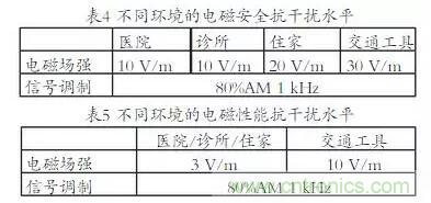 在過去關(guān)于醫(yī)療設(shè)備抗電磁干擾的標(biāo)準(zhǔn)中,往往僅考慮醫(yī)療設(shè)備在醫(yī)院內(nèi)的使用情況。但隨著科技的發(fā)展,許多設(shè)備逐漸變得輕巧、簡(jiǎn)便,方便患者在各個(gè)地點(diǎn)使用,特別是一些便攜式、植入式及可穿戴的醫(yī)療設(shè)備。例如植入式的心臟起搏器,要保證在各種場(chǎng)所能正常安全地工作,不會(huì)被其他電子發(fā)射信號(hào)或設(shè)備干擾。因此IEC60601-1-4《醫(yī)用電氣設(shè)備第1-4部分:基本安全和必要性能的通用要求:電磁干擾的測(cè)試和要求》,提出了電磁環(huán)境的分類以及如何根據(jù)環(huán)境來合理地確定抗干擾水平。在這版標(biāo)準(zhǔn)中,強(qiáng)調(diào)了不同的電磁環(huán)境,分別是醫(yī)院、診所、住家、交通工具。不同環(huán)境中的醫(yī)療設(shè)備所需的抗干擾水平,見表4~5。