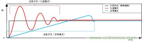 當(dāng)旋轉(zhuǎn)變壓器的電機(jī)位置或輸出信號(hào)變化迅速時(shí),穩(wěn)定時(shí)間是RDC控制系統(tǒng)的快速性能指標(biāo)[2]。圖1顯示的一個(gè)是有階躍輸入變化(黑線)的RDC反饋控制系統(tǒng)的穩(wěn)定時(shí)間的例子。藍(lán)色信號(hào)顯示的是對(duì)電路的正常模式響應(yīng),紅色信號(hào)顯示的是加速模式過(guò)程中響應(yīng)(角快速變化)。為了在快速變化的條件下追蹤到旋轉(zhuǎn)角,加速模式幫助控制回路很容易跟蹤到一個(gè)快速的旋轉(zhuǎn)角[4]。