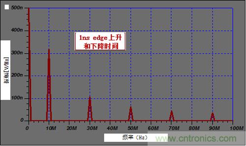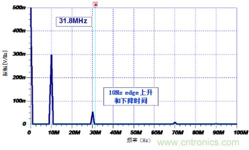 根據(jù)該公式,10nsEdge Rate對(duì)應(yīng)的諧波頻率大約為31.8MHz。圖3顯示:最后一個(gè)重要的諧波頻率為30MHZ。同時(shí),1ns的Edge Rate對(duì)應(yīng)的諧波頻率318MHZ(圖2)。如果頻率范圍擴(kuò)展到300MHZ以外,顯示的諧波仍很明顯,但卻在相關(guān)頻率上迅速變小。