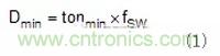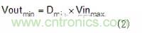 試圖在2MHz條件下工作時的第二個考慮因素是最小輸入電壓(VIN)和輸出電壓(VOUT)的轉(zhuǎn)換比。這與轉(zhuǎn)換器的最小接通時間有關(guān),因為該比率在轉(zhuǎn)換器需要操作時設(shè)定接通時間。例如,若轉(zhuǎn)換器具有100ns的最小導(dǎo)通時間且在2MHz條件下工作,則使用公式1,其可以支持的最小轉(zhuǎn)換比(Dmin)為20%。若給定的VIN至VOUT比所需的導(dǎo)通時間小于最小導(dǎo)通時間,則多數(shù)轉(zhuǎn)換器進入脈沖跨越模式以保持輸出電壓穩(wěn)定。當脈沖跨越時,開關(guān)頻率發(fā)生變化且可能在需要限制噪聲的頻率中引起噪聲。