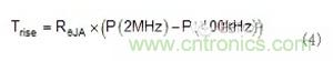 與開關(guān)頻率相關(guān)的轉(zhuǎn)換器中的兩個主要損耗是高側(cè)MOSFET和死區(qū)時間損耗的開關(guān)損耗。等式3是這些損失的基本估計,您可用它進一步分析伴隨較高開關(guān)頻率損耗增加的影響。例如,若為5V輸入、4A負載、3ns上升時間、2ns下降時間、0.7V體二極管壓降和20ns死區(qū)時間,預(yù)估功率損耗在2MHz時為325mW,在400kHz時為65mW。