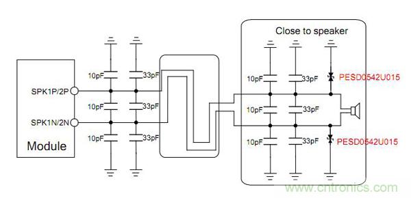 對于揚聲器的靜電保護,可以采用0402或0201的超低電容 ESD器件PESD0542U015,可以節(jié)約布板空間,且因為0.05PF的電容,可以保證此模擬信號的完整傳輸。