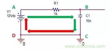 其隱含一個問題就是在PCB上其實V1的負極和C1的負極是有一條線(PCB layout工具軟件中用的詞比較準確,Trace,蹤跡/軌跡)。
