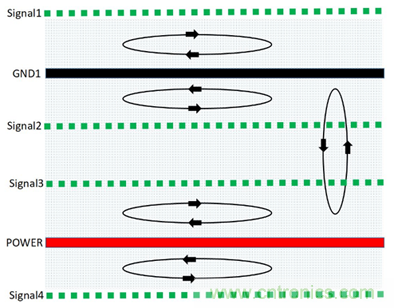 (1)此種結(jié)構(gòu),由于信號(hào)層與回流參考平面相鄰,S1和S2緊鄰地平面,有最佳的磁通抵消效果;