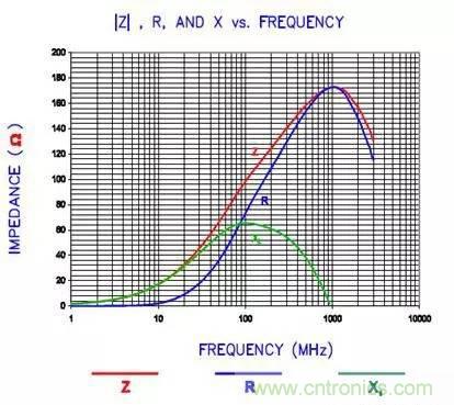 從等效電路中可以看到,當(dāng)頻率低于fL(LC諧振頻率)時(shí),磁珠呈現(xiàn)電感特性;當(dāng)頻率等于fL時(shí),磁珠是一個(gè)純電阻,此時(shí)磁珠的阻抗(impedance)最大;當(dāng)頻率高于諧振頻率點(diǎn)fL時(shí),磁珠則呈現(xiàn)電容特性。EMI選用磁珠的原則就是磁珠的阻抗在EMI噪聲頻率處最大。比如如果EMI噪聲的最大值在200MHz,那你選擇的時(shí)候就要看磁珠的特性曲線,其阻抗的最大值應(yīng)該在200MHz左右。下圖是一個(gè)磁珠的實(shí)際的特性曲線圖。大家可以看到這個(gè)磁珠的峰值點(diǎn)出現(xiàn)在1GHz左右。在峰點(diǎn)時(shí),阻抗(Z)曲線的值與電阻(R)的相等。也就是說這個(gè)磁珠在1GHz時(shí),是個(gè)純電阻,而且阻抗值最大。