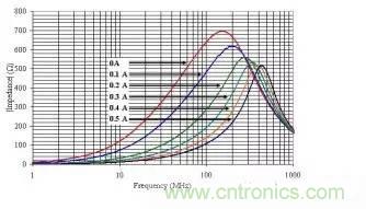 讓我們首先來看一下阻抗值同為600ohm@100MHz但尺寸大小不同的磁珠在不同偏置電流電流和工作頻率下的特性。