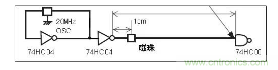 我們將兩個(gè)磁珠分別放在如下的20MHz的信號(hào)線上,看看對信號(hào)輸出會(huì)產(chǎn)生什么樣的影響。