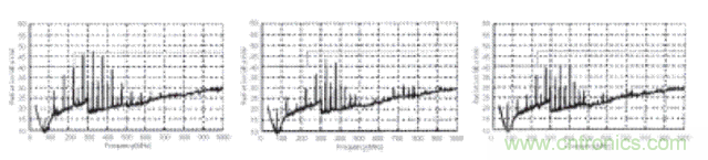 下面是上述三種情況對應(yīng)的EMI測試結(jié)果。結(jié)果是磁珠A和磁珠B都會(huì)對EMI噪聲產(chǎn)生很大的衰減。磁珠A在整個(gè)EMI頻譜范圍內(nèi)的衰減要稍好于磁珠B。