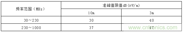 一般不同頻率段的限值是不一樣的,過渡頻率點應(yīng)該采取較低的限值,表1中230MHz的限值應(yīng)取較低值:30dB(µV/m)(10m法),40dB(µV/m)(3m法)。