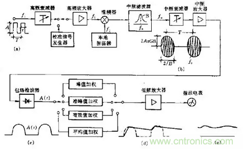 圖中(d)點的波形是準(zhǔn)峰值加權(quán)波形,(e)點是電表讀數(shù)。由于電表具有一定的慣性(即電表機械時間常數(shù))所以電表讀數(shù)將受一定影響,因此標(biāo)準(zhǔn)規(guī)定電表應(yīng)處于臨界阻尼狀態(tài),并具有確定的機械時間常數(shù)。雖然現(xiàn)在大多使用數(shù)字化電表,該指標(biāo)仍然保留,只要在A/D變換器后加一個二階低通濾波器即可。